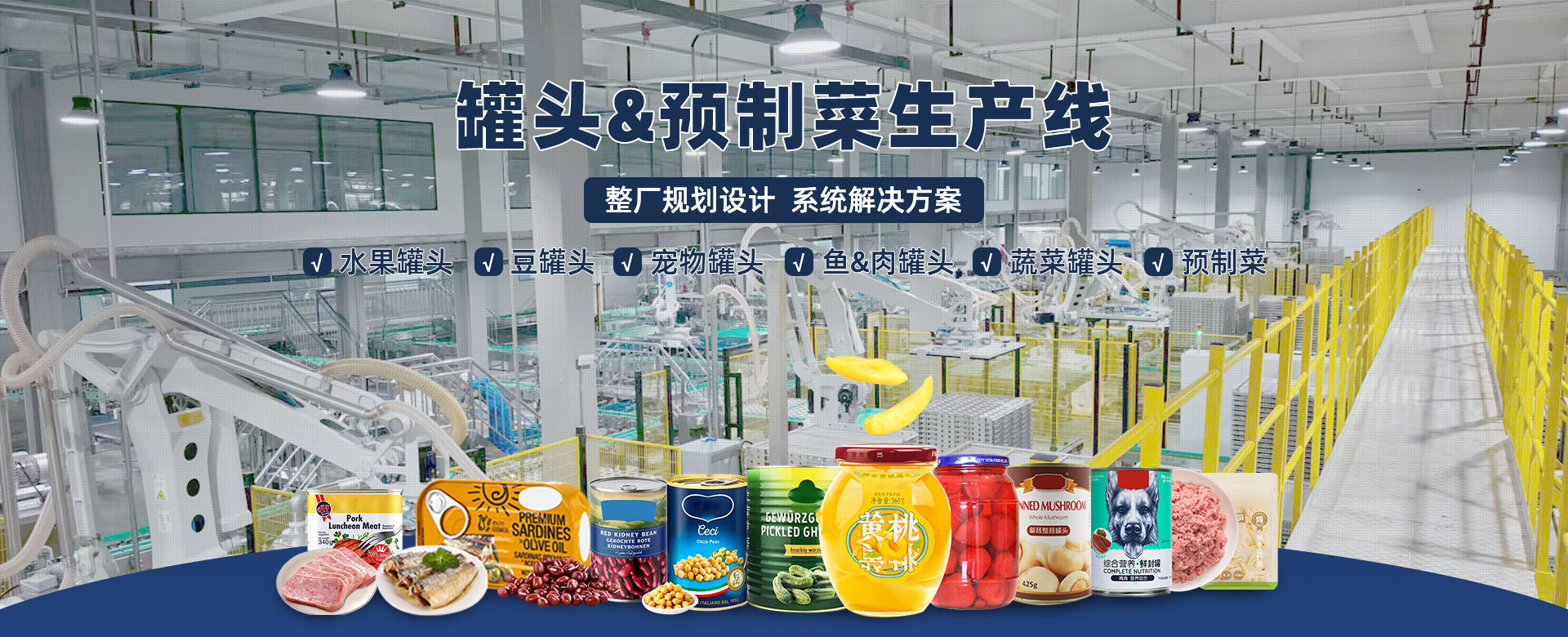 尼為機械為您提供罐頭生產線定制化設計、提供廠房規劃。 尼為機械為您提供黃桃罐頭生產線及其他水果罐頭生產線,魚罐頭生產線、肉罐頭生產線、蘑菇罐頭生產線等 設備,從清洗、預煮、冷卻、分級、修整、裝罐、排氣、殺菌、及后道包裝,為您提供整套生產線設備。